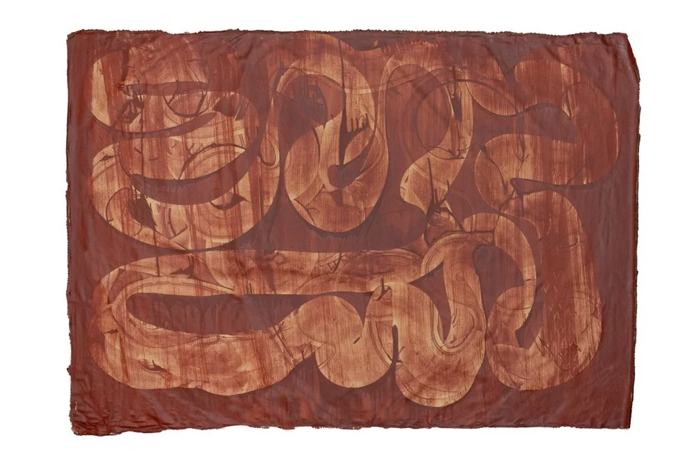 The expansive paintings embody a fusion of material exploration, craftsmanship, and personal emotions, rhythm, and movements. In the craft of coating textiles with latex lies a centuries-old tradition in Mexico. I had the privilege of learning this technique from Master El Compita in Misantla, Mexico. This technique became a catalyst for the visualization of emotions, which I transformed into an "Action" through the interplay of body and movement in the textile coating process. Veo Rojo emerged as a series composed of seven artifacts (paintings), which are to be understood as a visualization or manifestation of a transformative act of self-liberation. In Veo Rojo, I engage in an "Action," entering a trance-like state where my body is animated by rhythms, and using my entire body, my hands move across the canvases. I allow myself to release emotions, process traumas, or repaint stories.